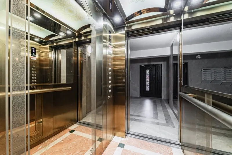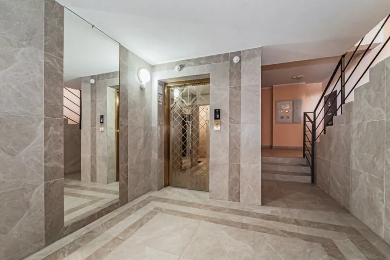 Подъезд с зеркалами, бесшумный лифт. Общедомовая система фильтрации воды.