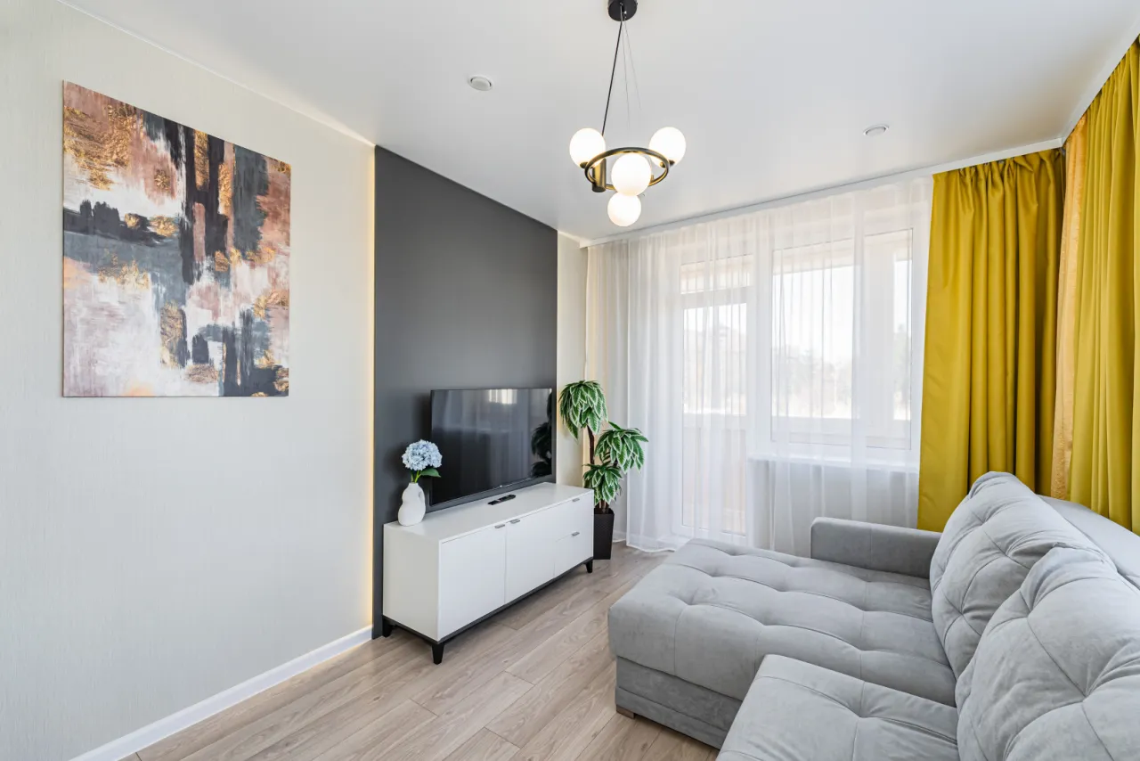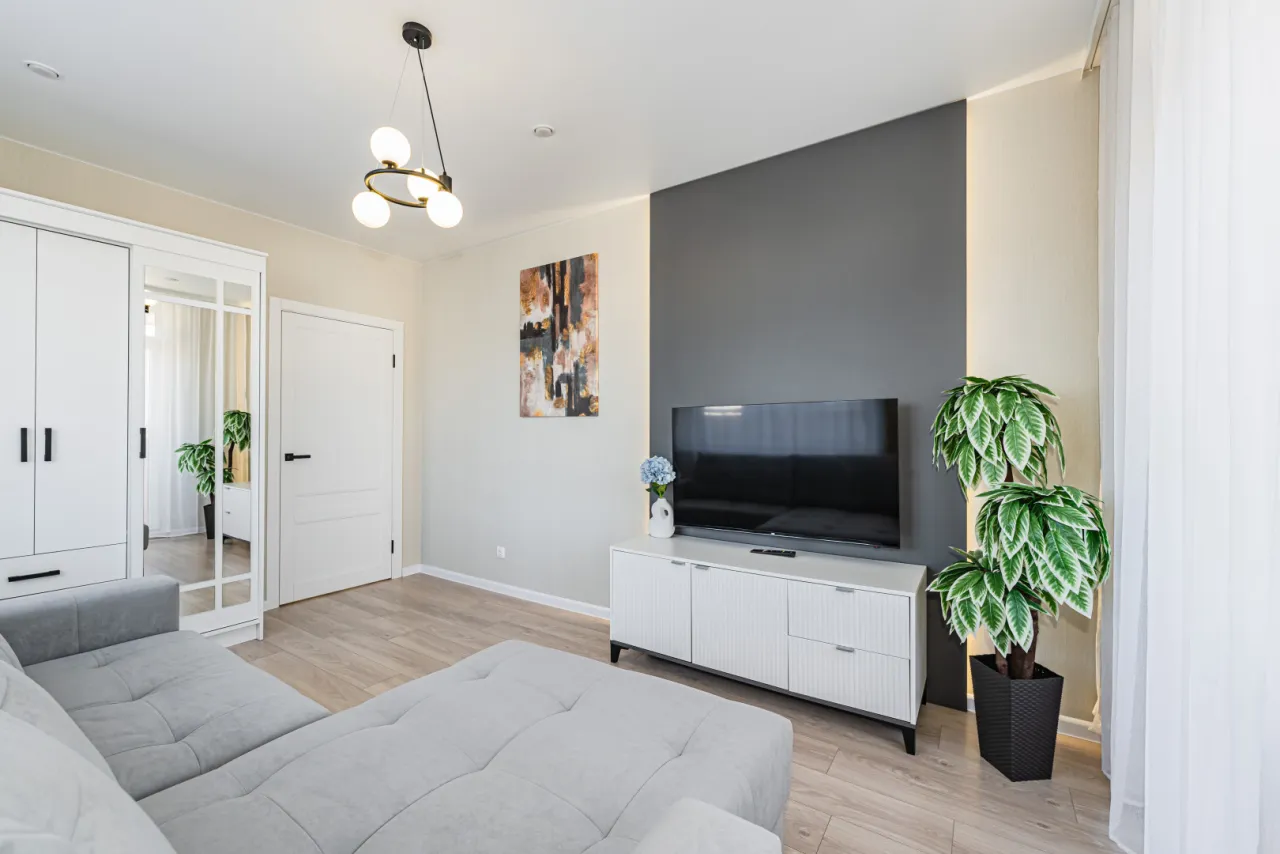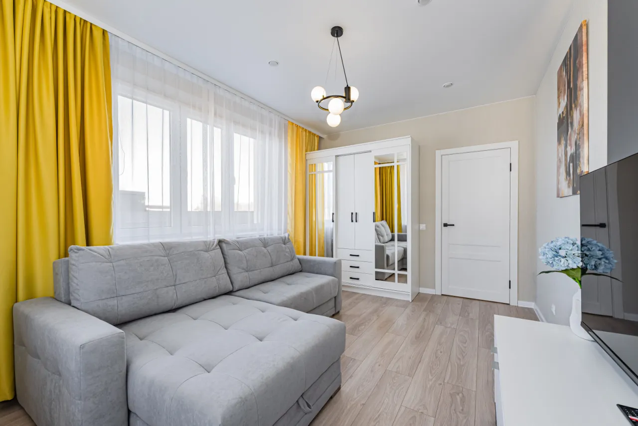 - спальня правильной квадратной формы (двухспальный раскладной диван, шкаф купе, телевизор)
