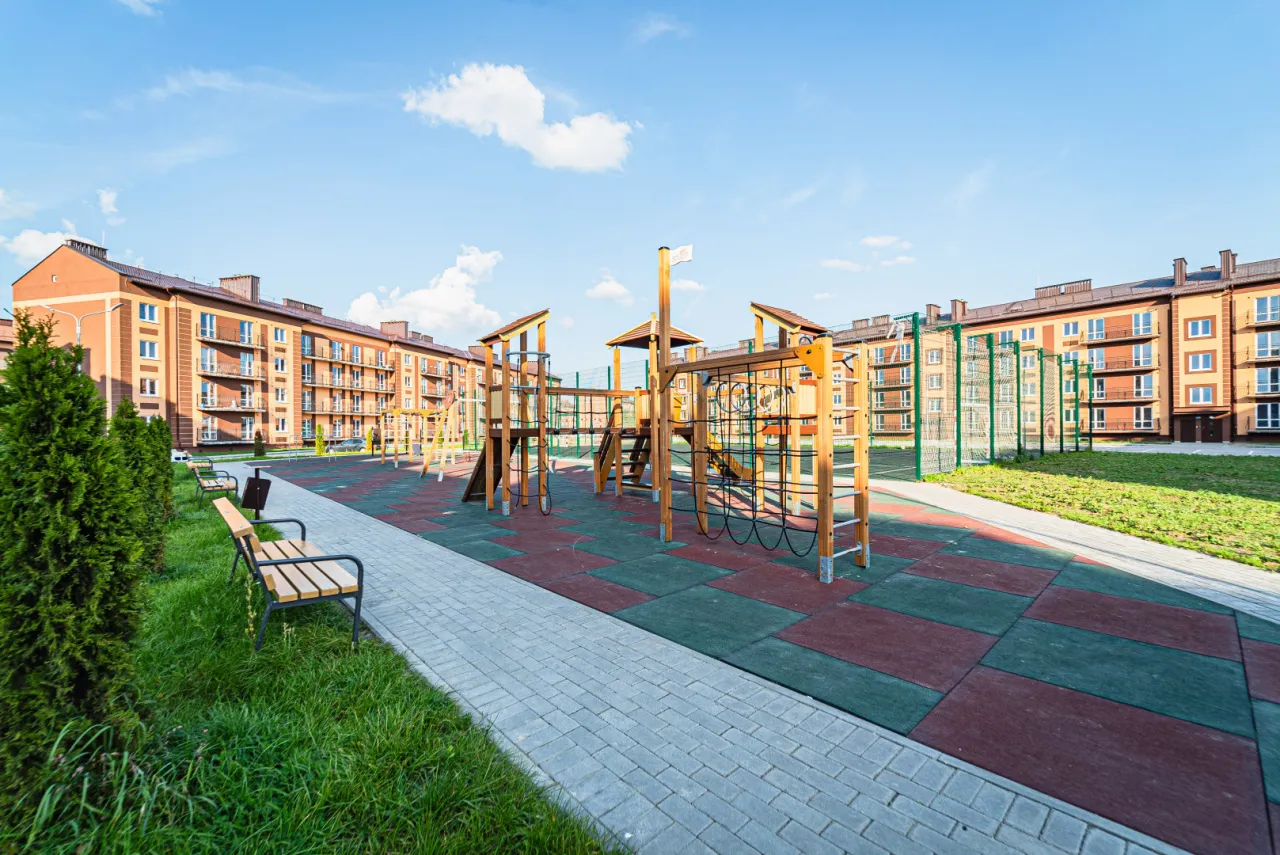 Красивый ухоженный двор, с детскими и спортивными площадками, также большая открытая парковка на территории комплекса.