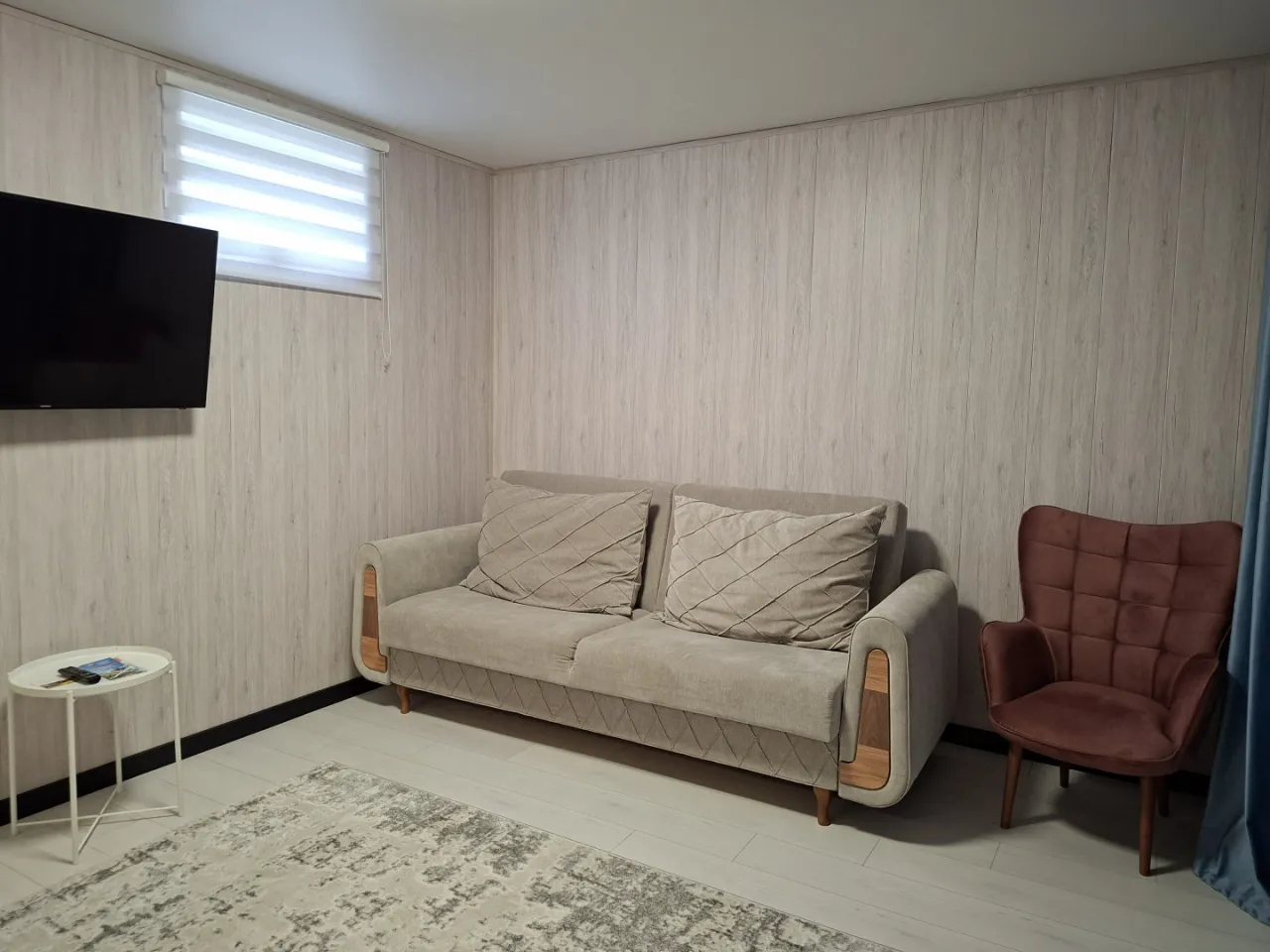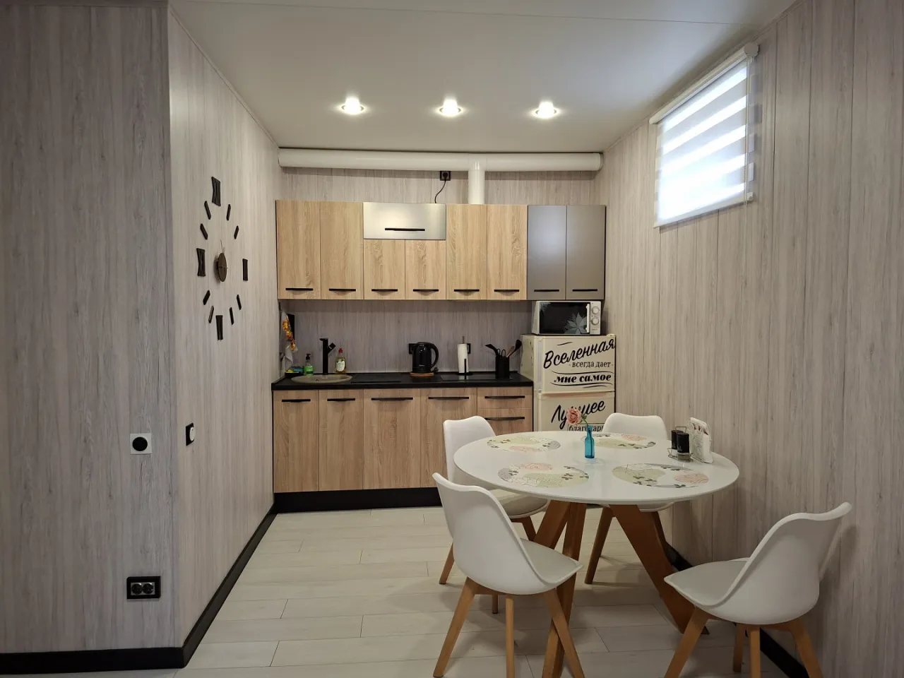 На площади 39м.кв расположены уютная кухонная зона и зона отдыха, ванная