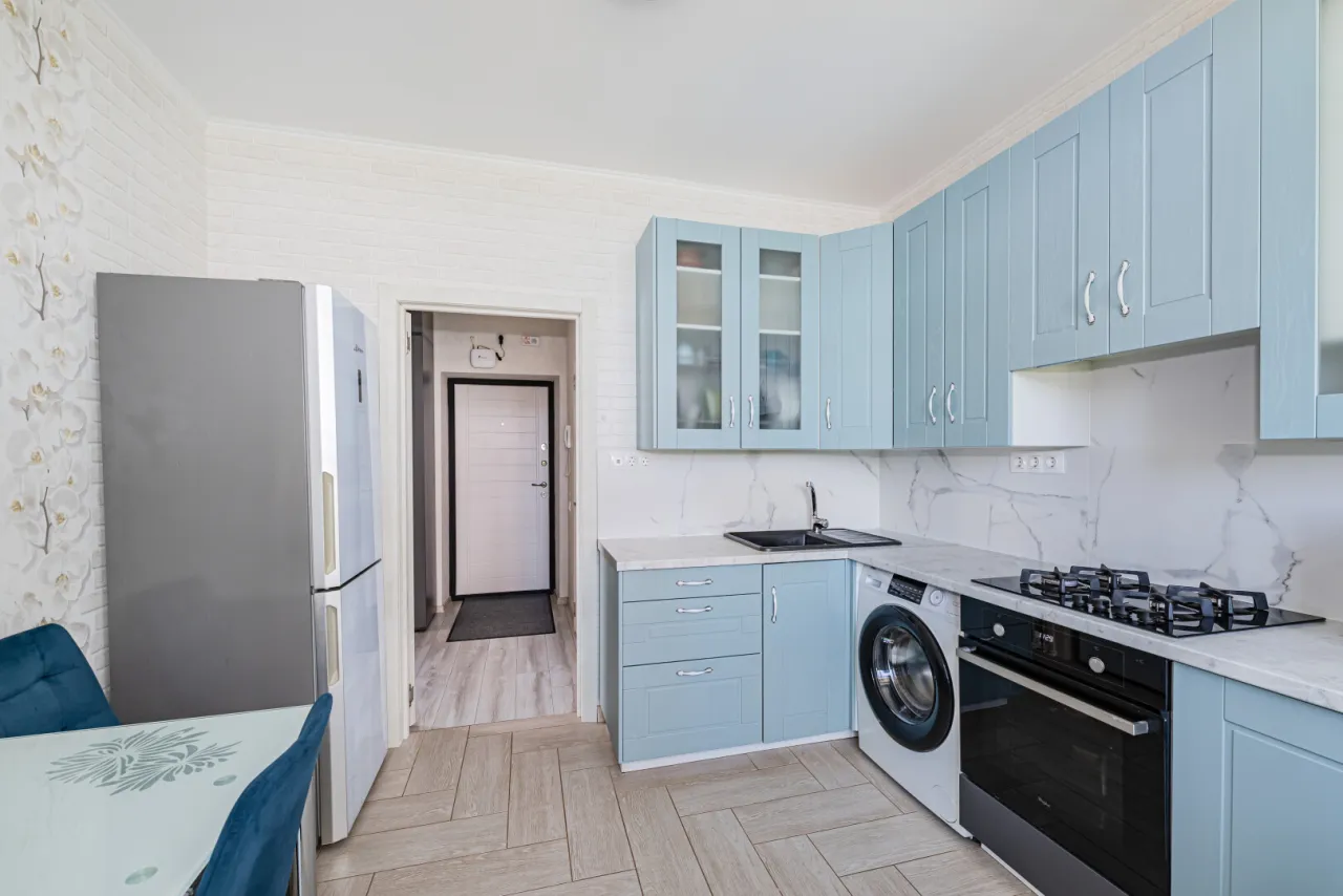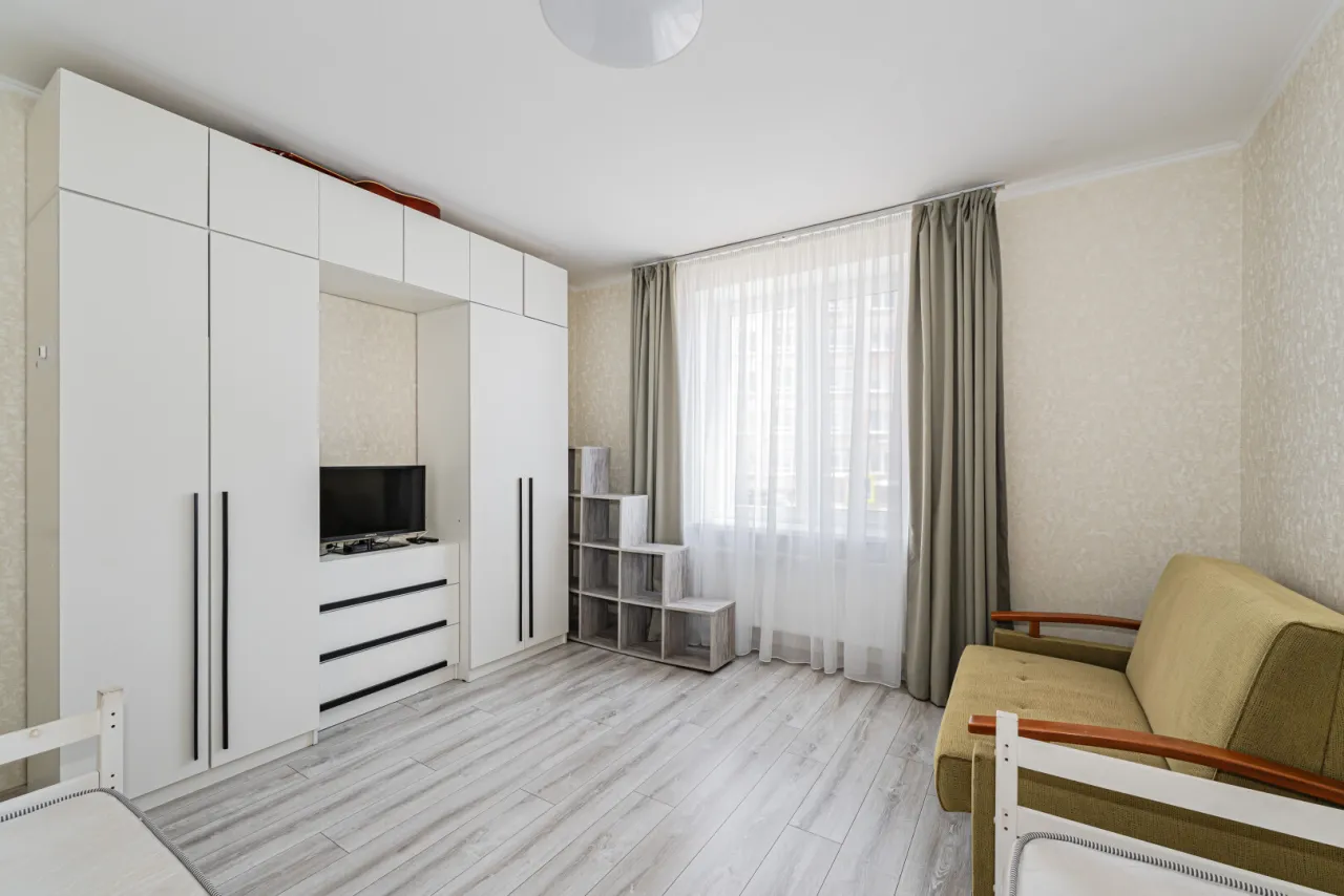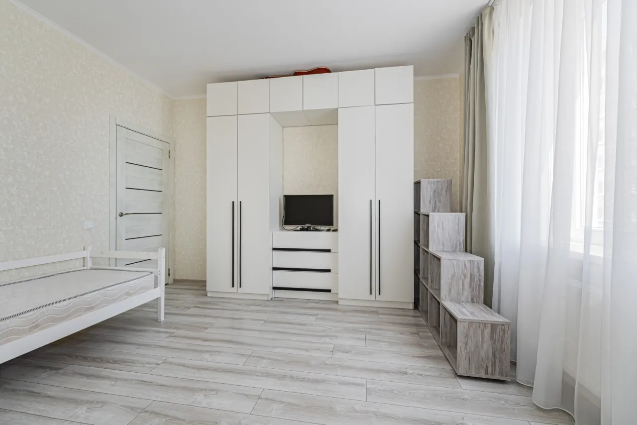 Выполнен современный ремонт в светлых оттенках, установлен теплый пол по всему периметру квартиры, потолки дышащие отштукатуренные, установлены шкафы для хранения, спальные места (детские и взрослые), встроена удобная кухня с комфортными системами выдвижения ящиков, в санузле ванна.