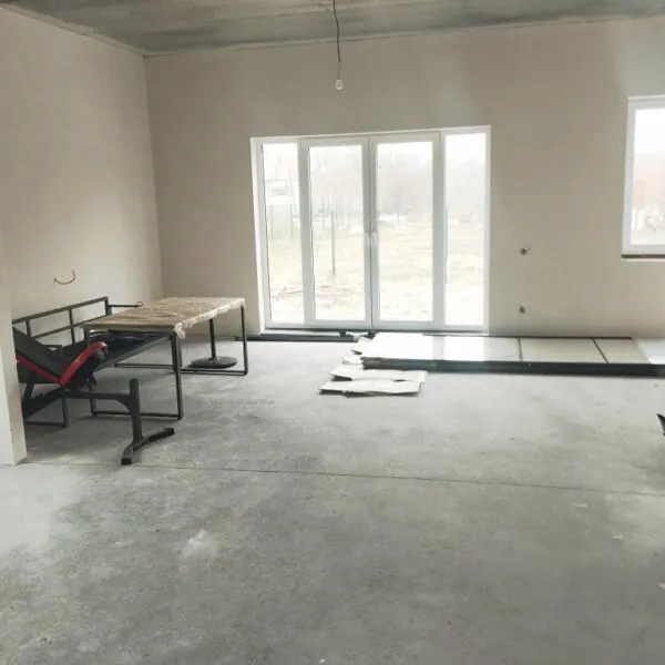 На первом этаже расположена большая кухня-гостиная-44 метра с выходом во двор ,санузел и подсобное помещение.