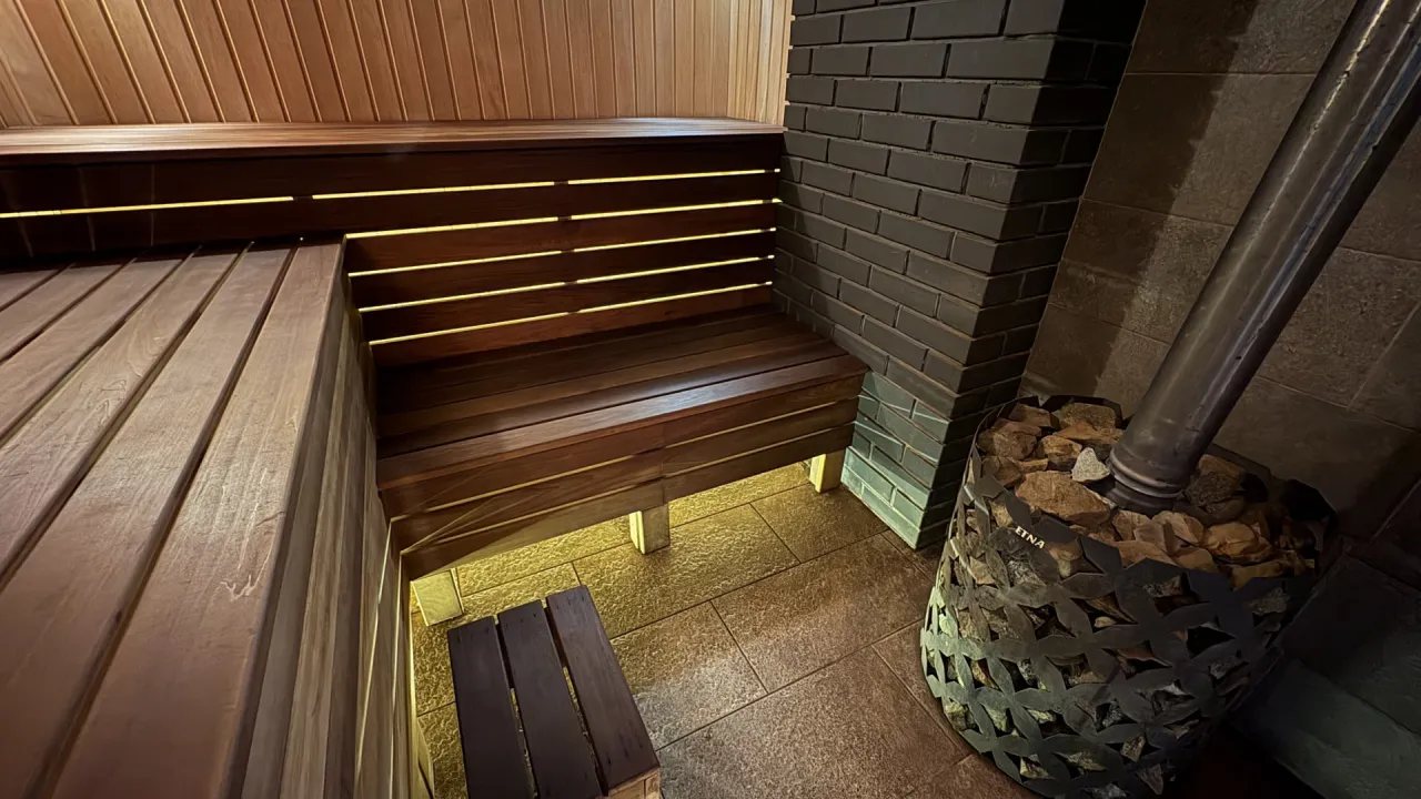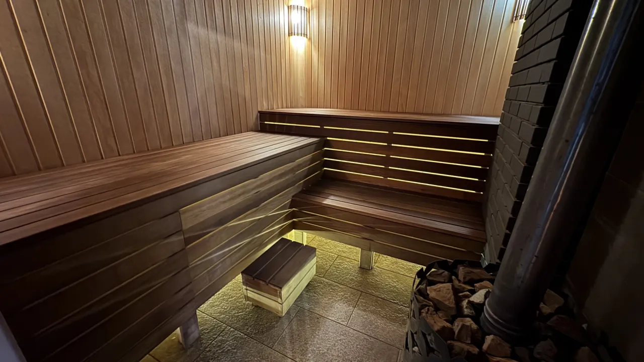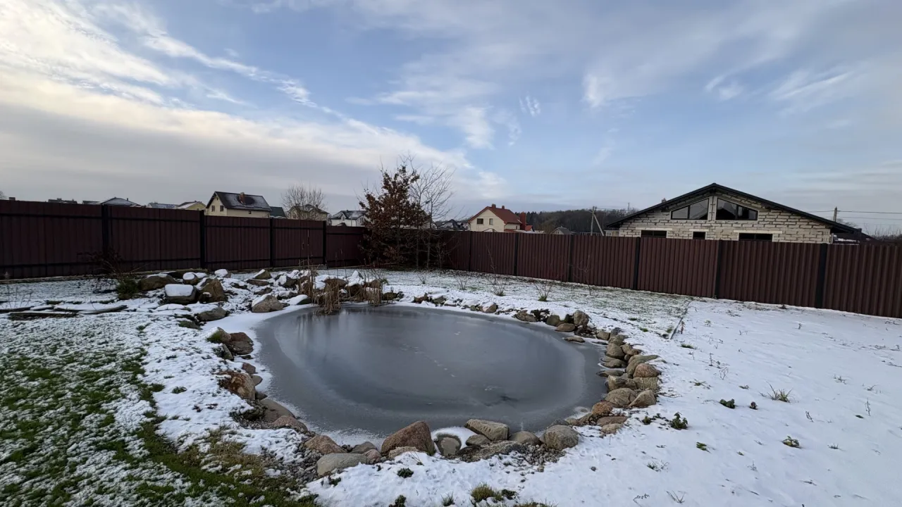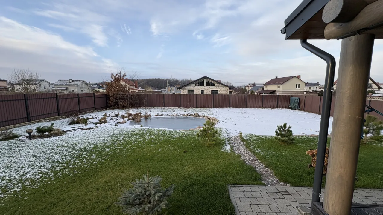 На территории площадка для игры в теннис, пруд охлаждаться после паренья, большая открытая терраса для отдыха после бани с деревянным столом и стульями.