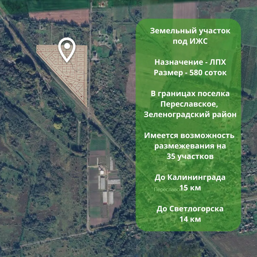 Участок расположен в посёлке Переславское, сразу за вторым переездом в сторону Светлогорска. С левой стороны дороги Калининград - Светлогорск. Это место идеально для тех, кто ценит близость к городской инфраструктуре и при этом хочет наслаждаться тишиной и природой.